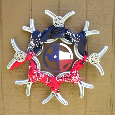 Texas Horseshoe Wreath with Texas in Circle Cutout, blue and red bandanas, and Texas Barbed Wire Conchos. I added concho screw adapters to the conchos and screwed them into the holes. I painted the cutout to resemble the Texas flag.